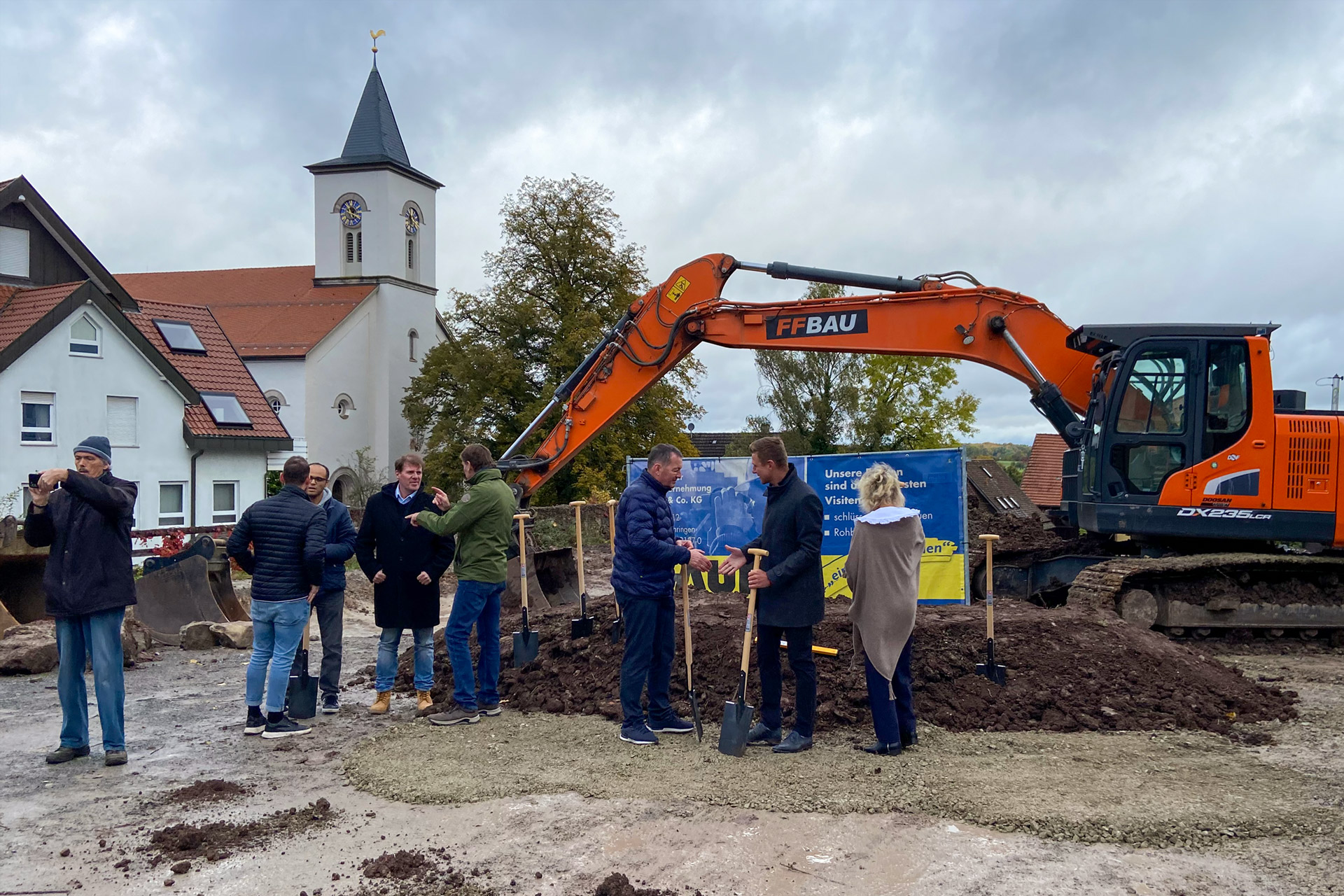 Zusammen mit dem Kommunalbau Mainhardt, der Stadt Mainhardt, beteiligten Baufirmen und Nachbarn konnte am 27.10.2023 der Spatenstich für eines neues Wohn- und Geschäftshaus inmitten von Mainhardt gefeiert werden.